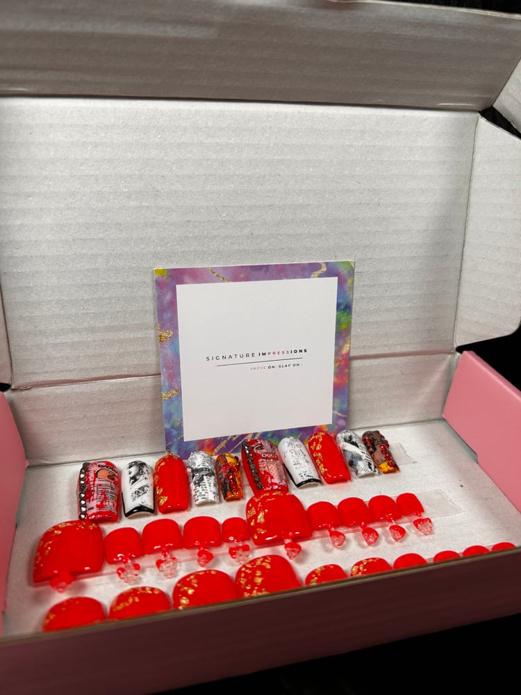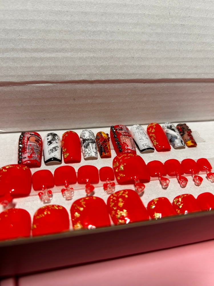 Ready to ship Nail Box with (1) set of super fun retro designed gel nail and (1) set of red press on gel toes
